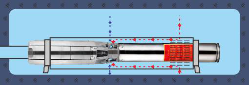 When the water well out of the water layer above the motor or in the pond, reservoir, the water flow directly from the bottom of the pump into the water section, the water around the motor does not flow, the water temperature will rise with the motor temperature (as shown in the blue dotted arrow below).