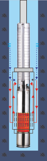 When the water well out of the water layer above the motor or in the pond, reservoir, the water flow directly from the bottom of the pump into the water section, the water around the motor does not flow, the water temperature will rise with the motor temperature (as shown in the blue dotted arrow below).