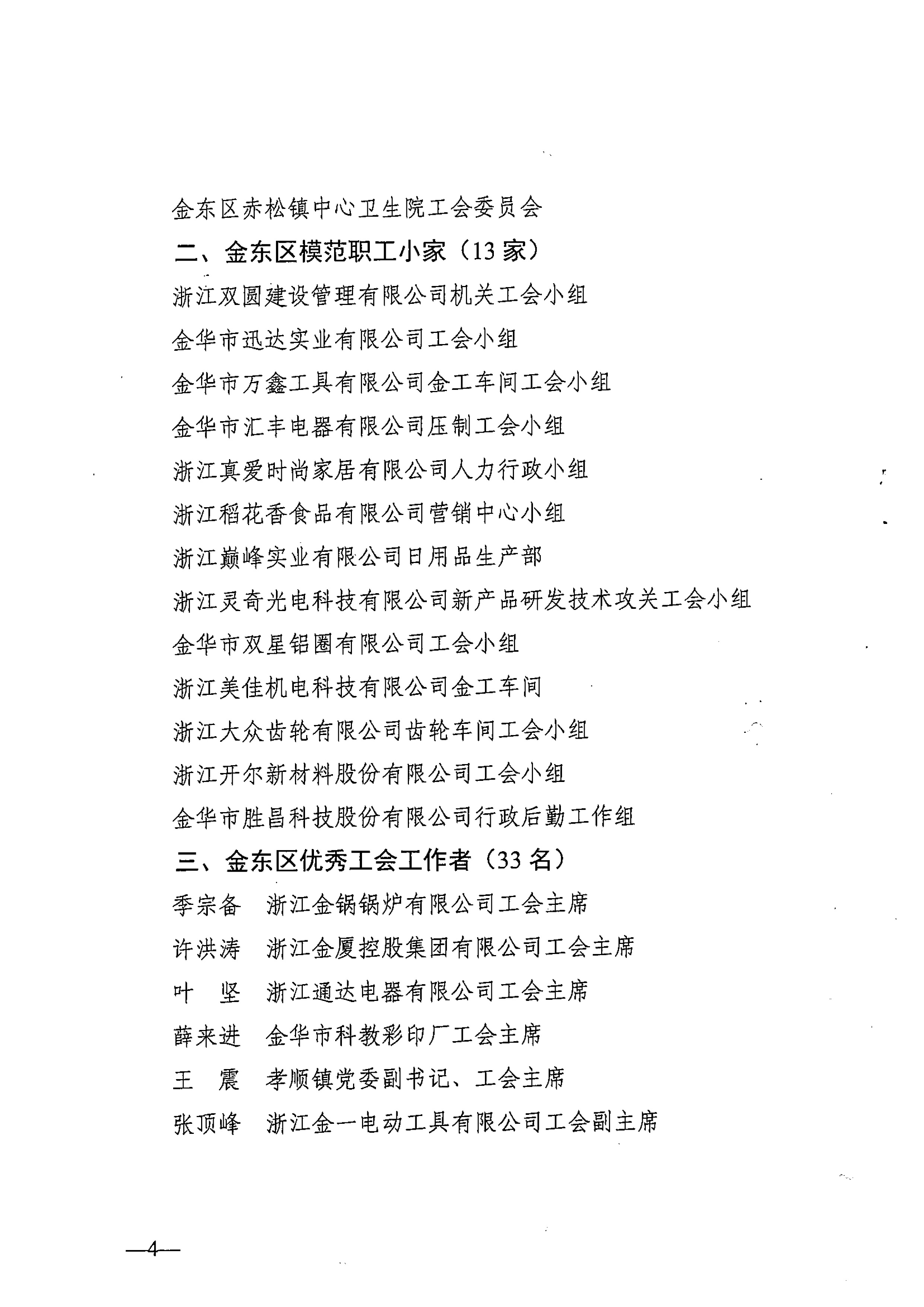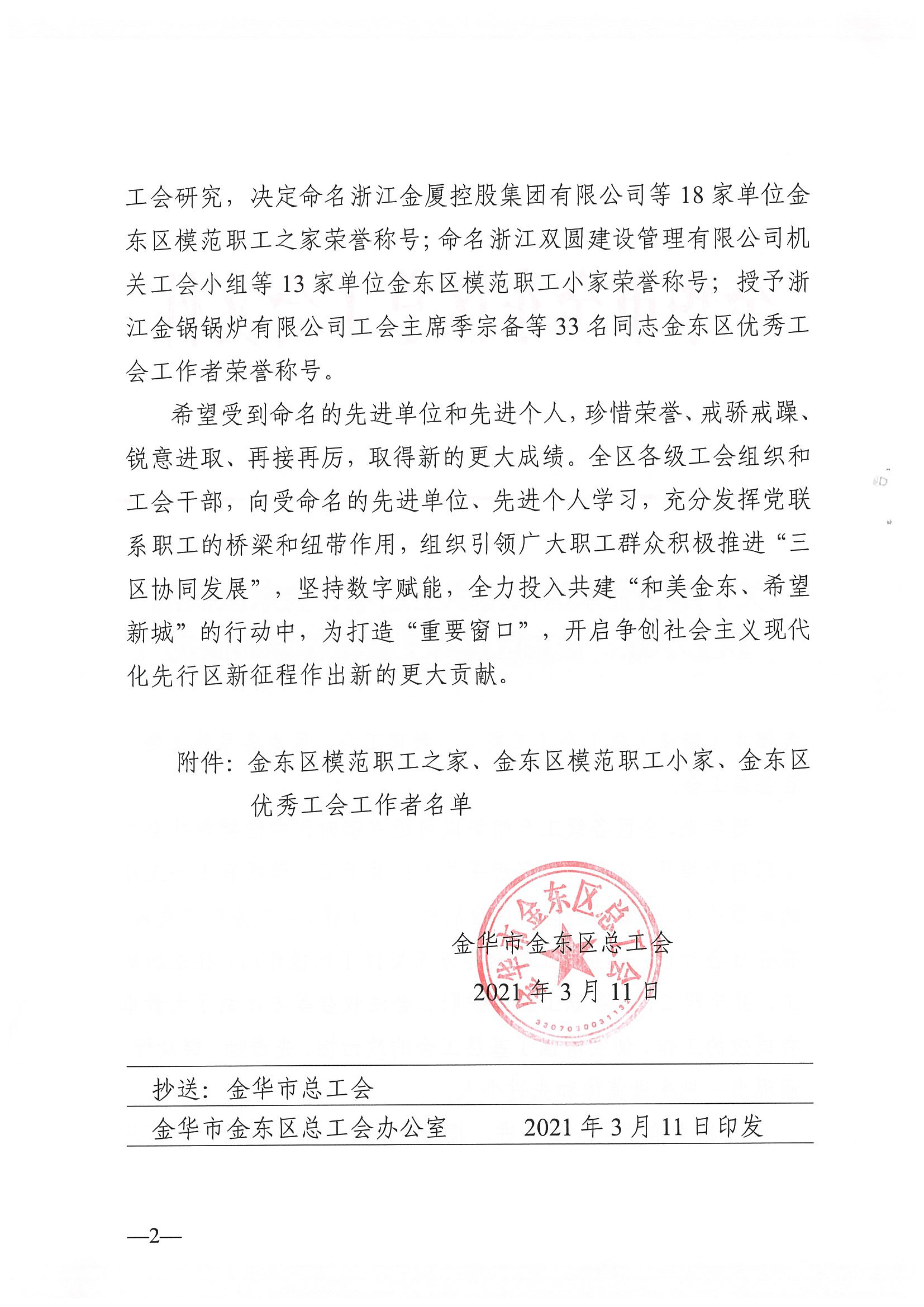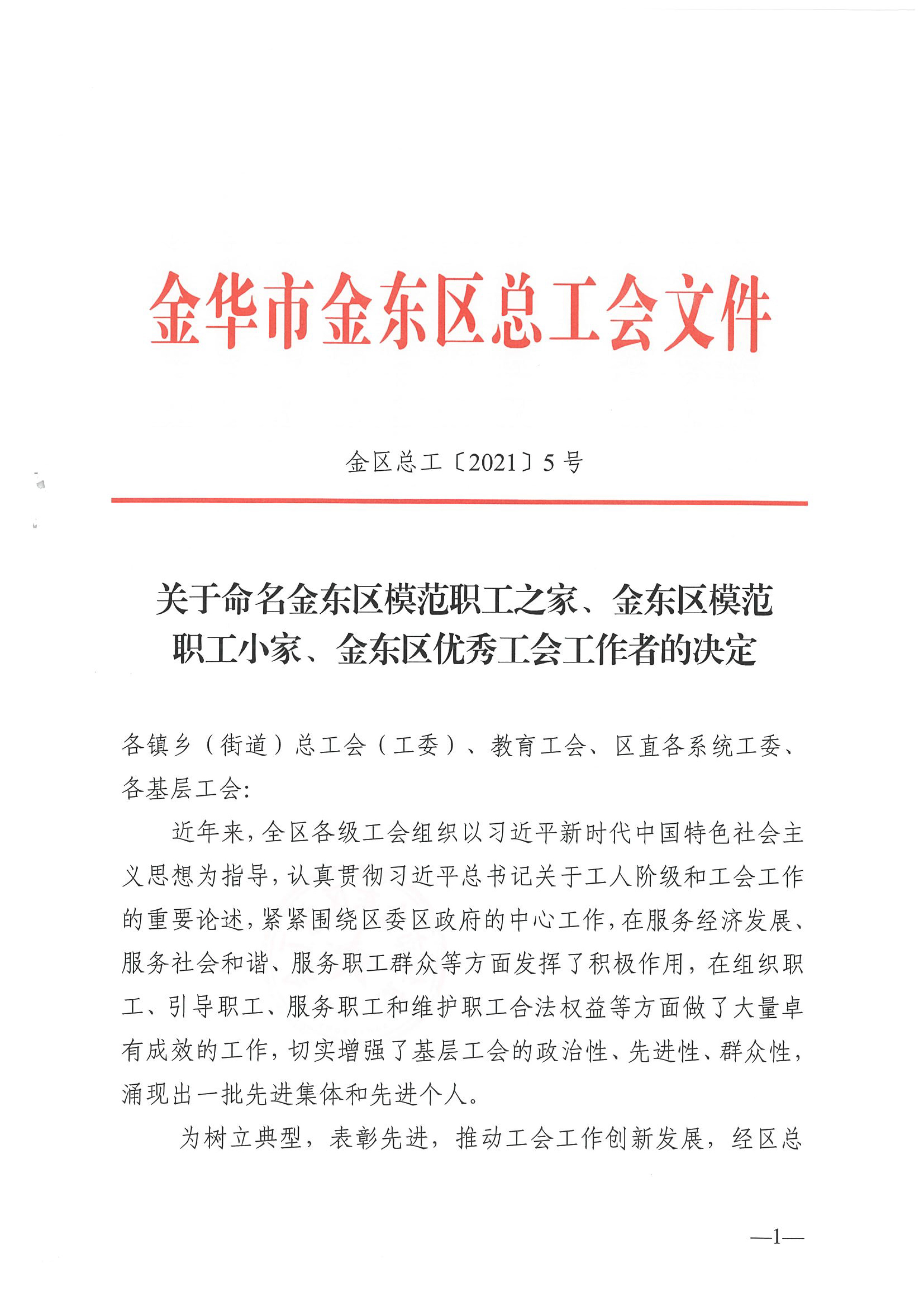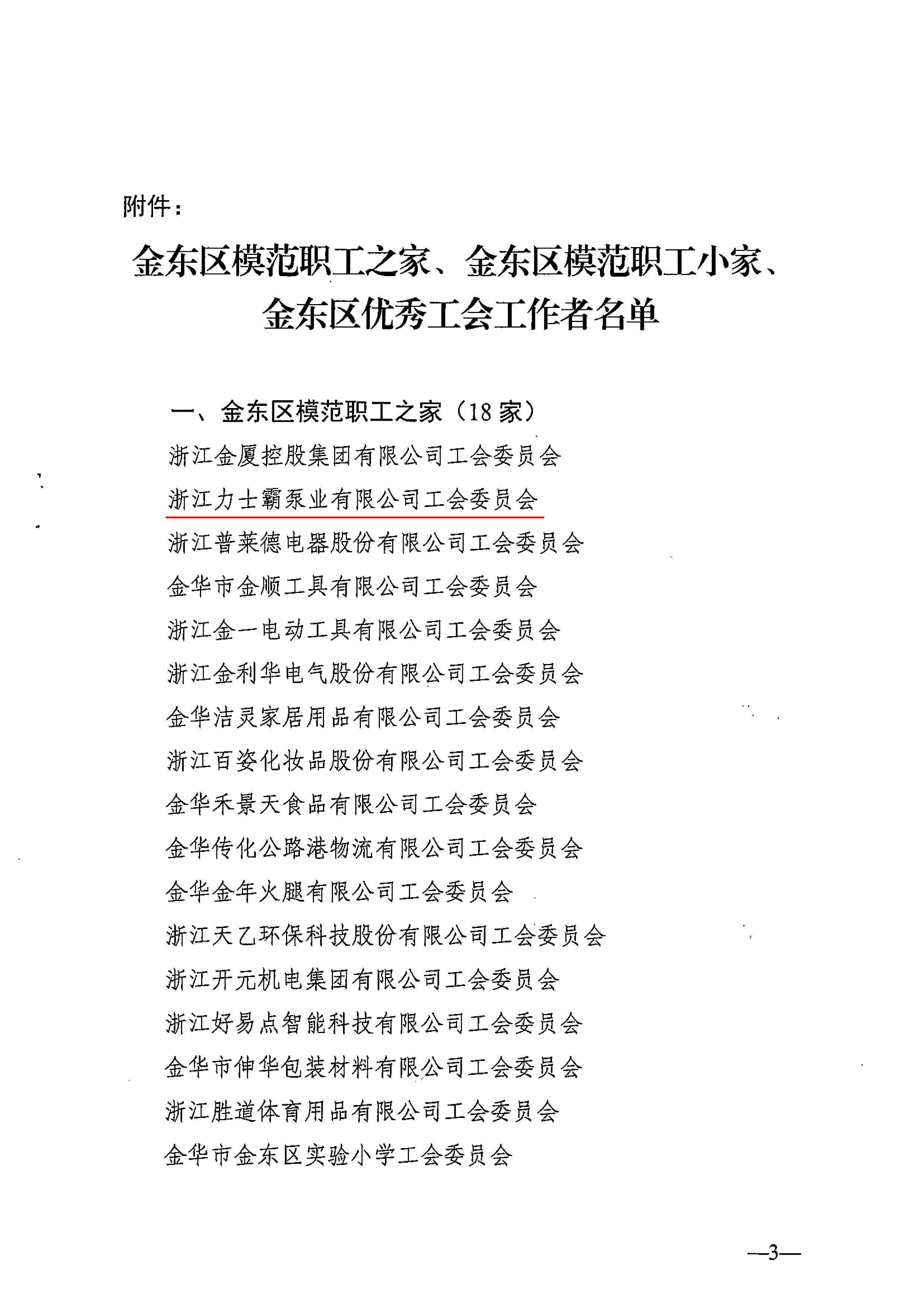 浙江力士霸泵业有限公司工会委员会获“金东区模范职工之家”